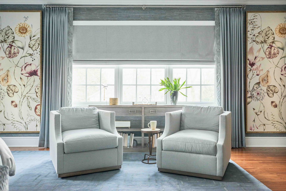 A serene primary suite in layered blues and soft florals, blending quiet luxury with timeless ease.
